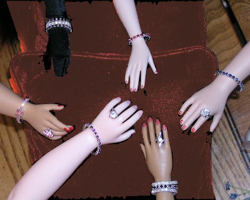 From left top, going clockwise: 3 small bracelets on Sydney with gloves, 1 small on Madra, 1 large on Kitty Collier, 3 small on CED, 1 large on Cissy, 1 small square stone on Cissy.