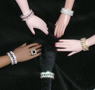 Available EXCLUSIVELY from Facets! Triple strand stretch bracelets A triple strand of tiny rhinestones in an elastic stretch cuff bracelet! These are specially sized for the dolls to fit as a nice cuff, not loosely. Shown in picture on Gene, Tyler, Madra, Tyler w/gloves, and CED. Sorry, these do not fit Alex. When putting them over gloves, use a little saran wrap to protect the glove fabric from snagging. Available in clear stones in gold or silver and in silver in clear/red/clear, clear/black/clear and clear/green/clear, clear/purple/clear, clear/pink/clear, silver/all aurora borealis, gold/all aurora borealis. $10 each |