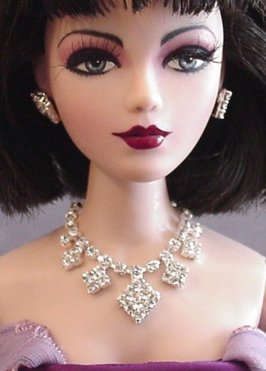Petite A smaller scale of my Diamante set, this features clusters of rhinestones forming graduated diamond shapes. Also available in gold. Earrings may vary. $25 for necklace/earring set This can also be made for Barbie or other 11 1/2" dolls. $21 for necklace |