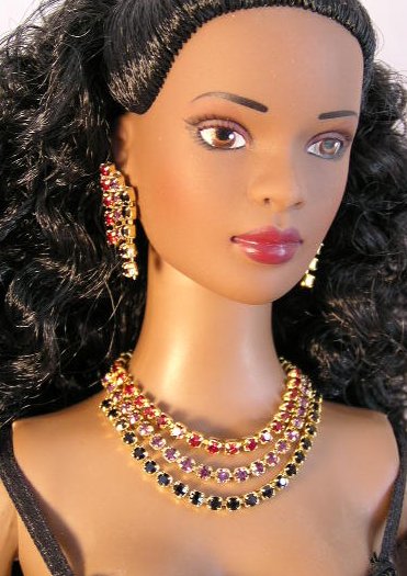 Tri-Strand Three graduated strands of rhinestones done in a variety of color combinations. Includes earrings. Available in the following colors: