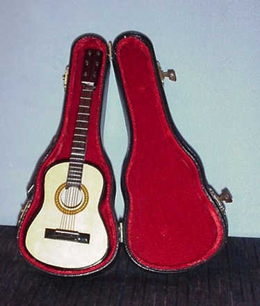Beautifully detailed wood guitar. Comes with red velvet lined faux leather carrying case. A lovely miniature!