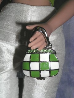 CHECKERED HANDBAG Metal handle with enamel check pattern and rhinestone "stripe". Decorated on both sides. This purse opens as a locket. Available in: Black