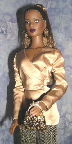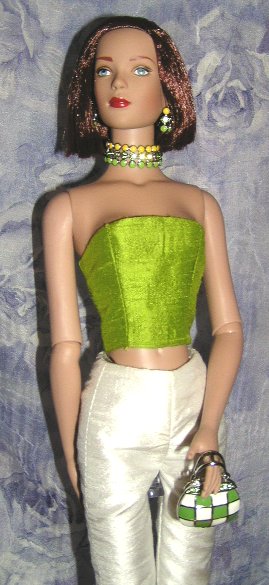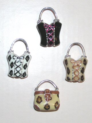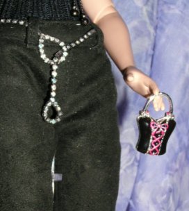 CORSET PURSE This chic trendy design is a purse shaped like a corset. This metal purse does not open. Available in black with pink "laces", leopard or white leopard. Shown on the left with Silkstone Barbie (11") and below with Tyler Wentworth (16").