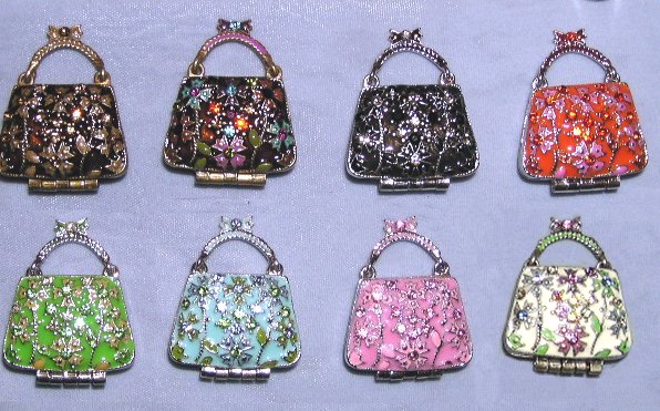 FLORAL HANDBAG Metal handle with enamel and rhinestone flower decoration. Decoration on one side only. Metal on the other. This purse opens as a locket. Available in: