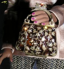 LEOPARD BOW PURSE Cocoa brown enamel with a raised bow design in leopard print. Beaded strap handle. This purse does not open. Shown on the left with Veronique/Fashion Royalty (11") and below with Tyler Wentworth (16").