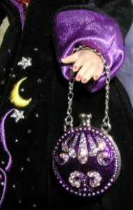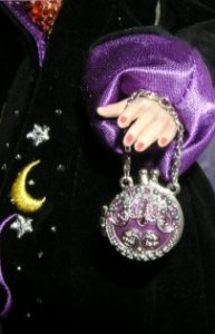 ROUND PURSE Wrist chain with old-fashioned styling in enamel, rhinestones and faux marcasite. Decorated on one side only. This purse opens as a locket. Available in: Black and purple Also available in a smaller size, for a more delicate look! See the 11" purses page for colors!