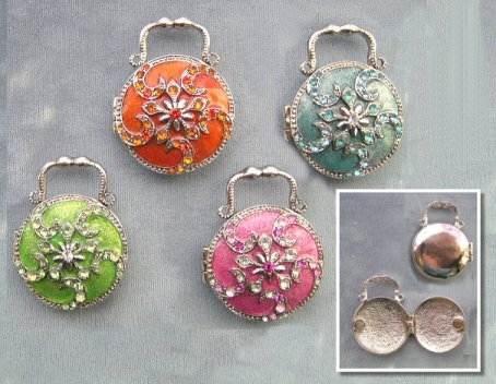 ROUND SWIRL PURSE A swirly starburst design in rhinestones and silver stand out on the colored enamel of this purse. Decorated on one side only. Metal on the other side. This purse opens as a locket. Available in: Green - other colors sold out. |