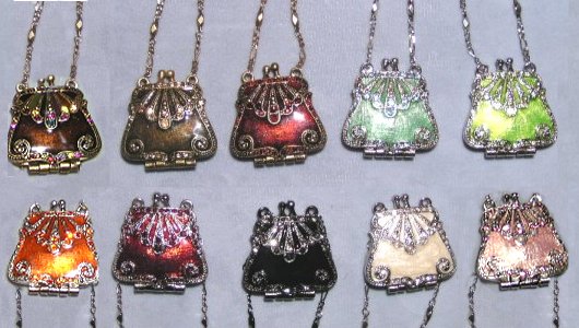 These beautiful purses are heavy metal finished pieces with enamel, rhinestones and faux marcasite touches. They are all 3-dimensional and some of them open as lockets. I can adjust the chain lengths if you want them longer or shorter.