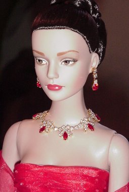 This doll is an ideal candidate for fancy jewelry. She can wear just about anything - gold or silver. I have a few sets that I have created with Light Siam stones, a bright orangy-red which matches her gown perfectly. Alternatively, I have many other styles in ruby stones which look nice, but the color is not AS perfect. All clear stones are also dazzling!