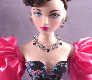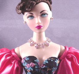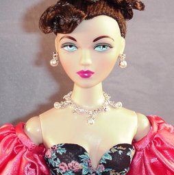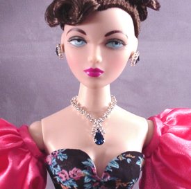 This doll has an over the top dress (well, the gloves are over the top) and can carry off all kinds of jewelry. The colors in the dress allow you to pick up a variety of colors in jewelry - fuchsia, pink, sapphire, aqua... Or you can go with all clear stones, aurora borealis (rainbow coated) or pearls.