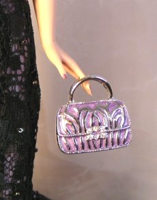 SMALL ART NOUVEAU PURSE Marblized enamel with silver accents in an art nouveau design and a rhinestone faux clasp. Decorated on one side, smooth silver on the other. This purse does not open. Handle has cut-outs so you can insert doll's fingers, but you can also use a small rubber band to secure the hold and position. Available in purple, red or magenta (not shown). |