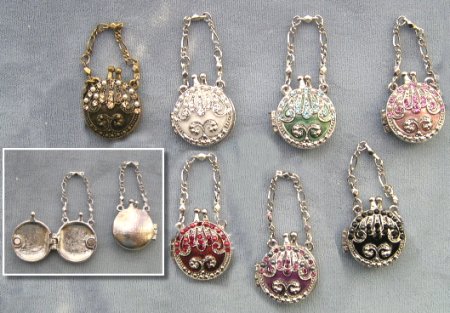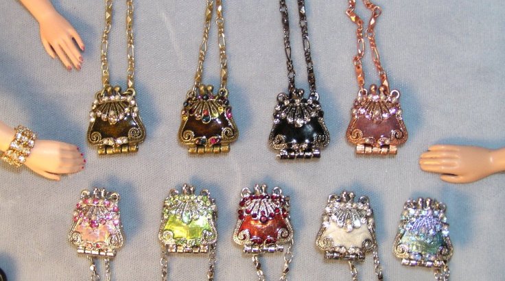 These beautiful purses are heavy metal finished pieces with enamel, rhinestones and faux marcasite touches. They are all 3-dimensional and some of them open as lockets. On the ones with chains, I can adjust the chain lengths if you want them longer or shorter.