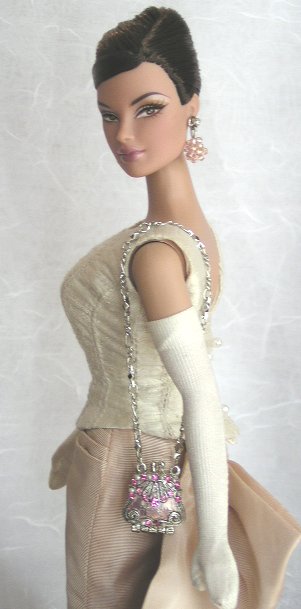 CORSET PURSE This chic trendy design is a purse shaped like a corset. This metal purse does not open. Available in leopard or white leopard - black/pink is sold out. Shown on the left with Silkstone Barbie (11") and below with Tyler Wentworth (16").