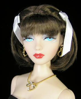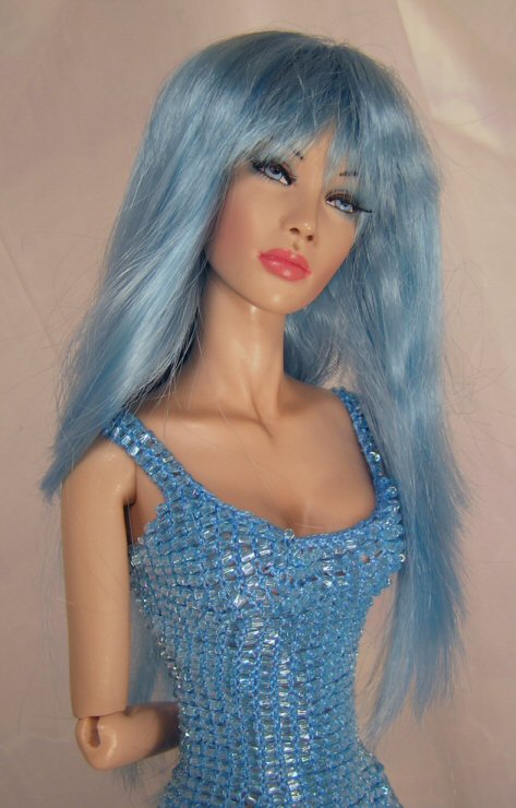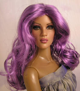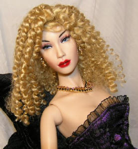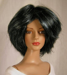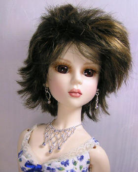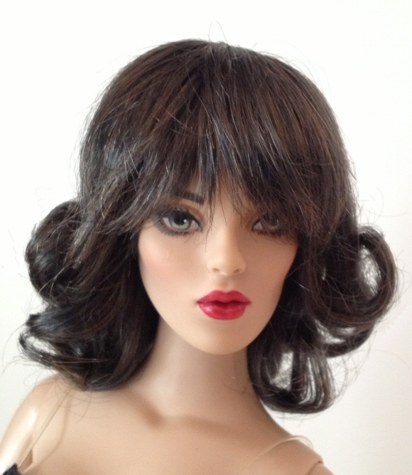 Most of the following "fun" colors are not a blend. They are black/brown combination with a small streak of color on one or both sides of the front. Both wigs to the left are the Black/Brown/Gold, but the size 5/6 has highlights on both sides. The other colored wigs only have a streak, like on the Goodreau Innuendo doll shown. The ones that I have in stock (bold) are on clearance for $15. Others can be ordered.