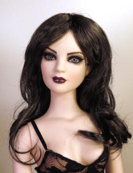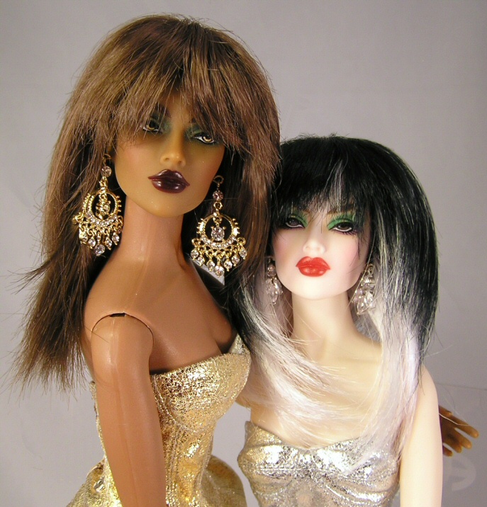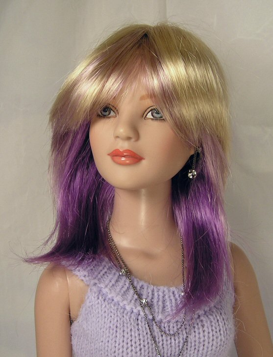 Blonde/Purple modeled by Tonner American Model Size 5/6 Chestnut Brown/Brown Black (not available) and Black/Snow White modeled by 16" AvantGuard dolls |