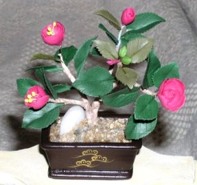 Japanese Bonsai blooming bonsai in stone garden in a low Japanese style pot |