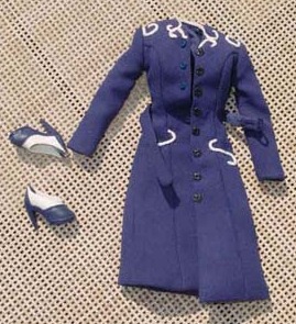 - Navy blue tailored dress with buttons down front and white trim accents