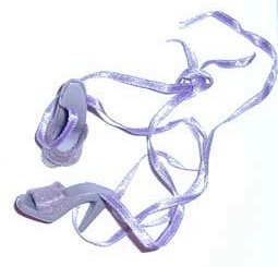 - Version 1: Gray felt toes strap and ankle strap, but with a felt strap threaded through and hooking with a clear plastic hook and filament. This was very fragile and tended to break, so was replaced within the first year by version 2 with the ribbon tie and ankle strap.
