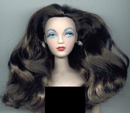 - Brunette doll with long hair put up in rolled ponytail on top of head