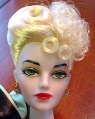 Light blonde Madra with upswept hair and curls on side of forehead. Rolled under on both sides of head in back.