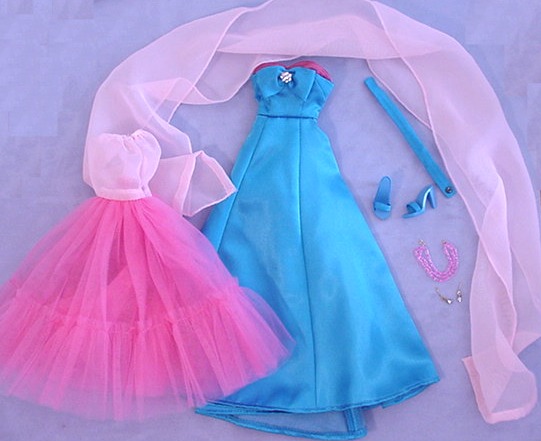 - strapless aqua blue satin flared evening gown with hot pink trim and rhinestone pin at bustline