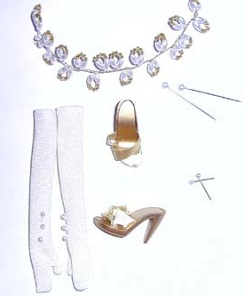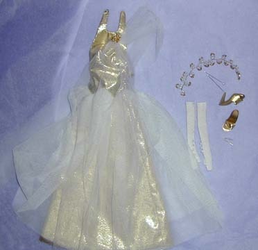 of soft tulle, shoulder brooch in a gold swirl design with a centered pearl
