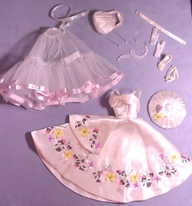 - cream satin dress with floral ribbon embroidery