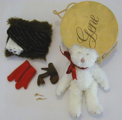 - hatbox with gold top and Gene logo. Sides are multicolored