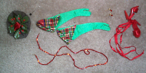 - Detachable train of plaid cotton, cut like a man's tie on the bias and faced with red satin.