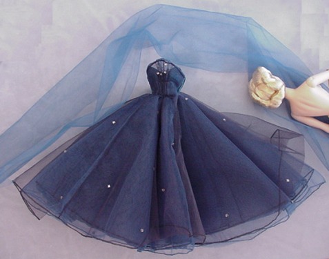 - blue strapless gown with multiple layers of tulle as skirt. Tulle
