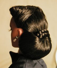 - jet black hair is in an elaborate chignon with braids