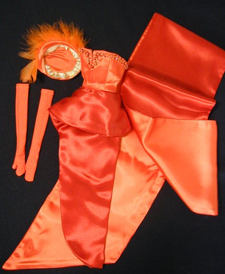 - Satin orange straight gown, split up to the knee, with peplum and gold