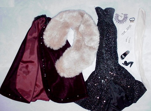 - beige "fur" stole with lined detachable cape in claret velvet w/