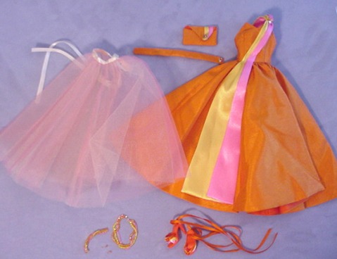 - orange dress w/pink and yellow over the shoulder sash