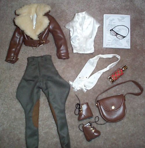 - brown leather lace up boots, built up inside to accommodate the doll's high heeled feet. Tiny black cord laces over tongue through gold grommets.