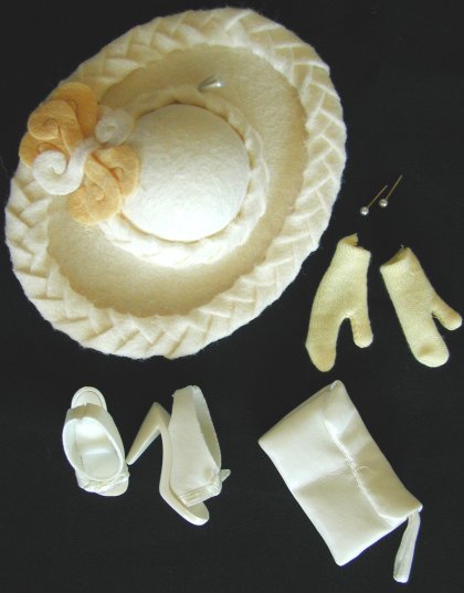 - brunette doll with pincurls at forehead and hair pulled back in ponytail.
