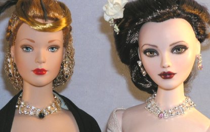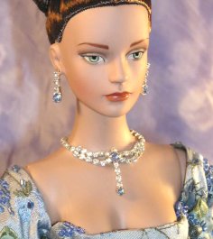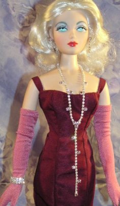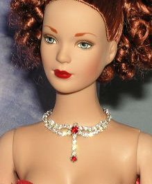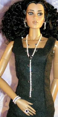 Elizabeth $25 Available in black, light amethyst, light sapphire and aurora borealis. The long Y-necklace is great for all sizes of dolls. Both dolls are shown wearing my new triple strand elastic rhinestone bracelets - available in clear (gold or silver), clear/red, clear/green and clear/black. |