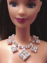 Petite A smaller scale of my Diamante set, this features clusters of rhinestones forming graduated diamond shapes. Also available in gold. Earrings may vary. $25 for necklace/earring set This can also be made for Barbie or other 11 1/2" dolls. $21 for necklace |