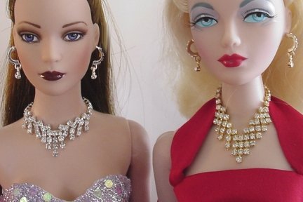 $20 for necklace Note: Earrings can be made with standard posts or thicker posts to fit the large pre-cut holes made by Mattel. Also, necklace can be made with hook closure or solid, which would require removing doll's head to put it on.