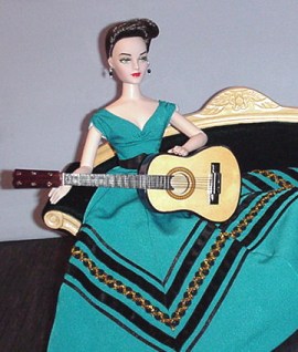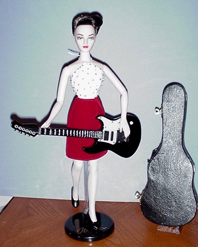 Beautifully detailed "electric" guitar, proportioned for 15" - 16" fashion dolls. It is available in either red or black with white accents. It comes with a velvet lined case and a wood guitar stand, so you can stand it up between songs. Note: Guitar is not actually electric!