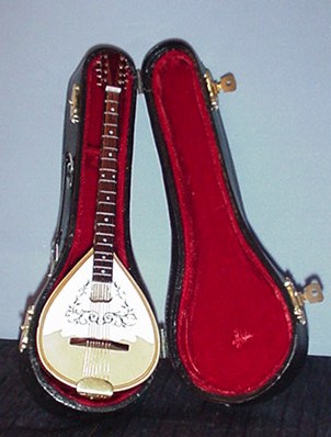 Beautifully detailed wood sitar-like instrument proportioned for 15" - 16". Technically, I think it is a bouzouki - a Greek instrument, as the tuning keys on a sitar are different. Includes velvet lined, faux leather carrying case. Very well-made miniature instrument.