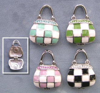 CHECKERED HANDBAG Metal handle with enamel check pattern and rhinestone "stripe". Decorated on both sides. This purse opens as a locket. Available in: Black