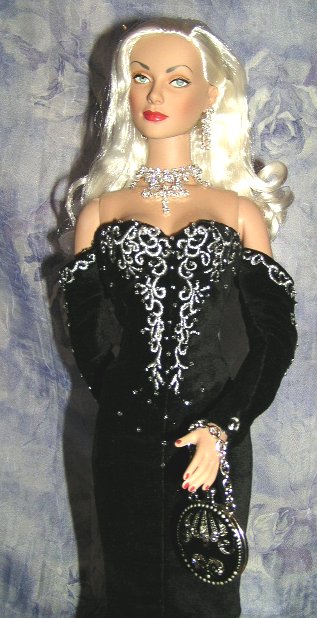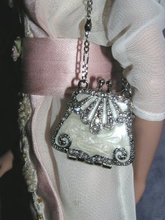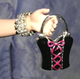 CORSET PURSE This chic trendy design is a purse shaped like a corset. This metal purse does not open. Available in black with pink "laces", leopard or white leopard. Shown on the left with Silkstone Barbie (11") and below with Tyler Wentworth (16").