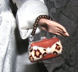 LEOPARD BOW PURSE Cocoa brown enamel with a raised bow design in leopard print. Beaded strap handle. This purse does not open. Shown on the left with Veronique/Fashion Royalty (11") and below with Tyler Wentworth (16").