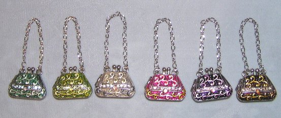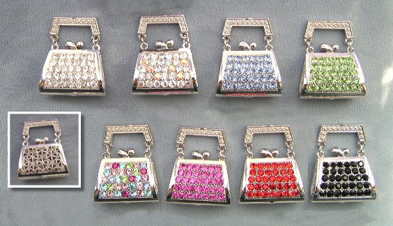 SCROLL PURSE Wrist chain with scroll designs in enamel with rhinestone accents. Decorated on one side only. Metal on the other side. This purse opens as a locket. Available in: Aqua, Green, Gray, Red, Black, Orange and Topaz Other colors sold out |