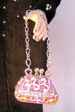 ROUND PURSE Wrist chain with old-fashioned styling in enamel, rhinestones and faux marcasite. Decorated on one side only. This purse opens as a locket. Available in: Black and purple Also available in a smaller size, for a more delicate look! See the 11" purses page for colors!