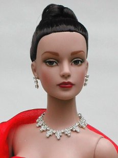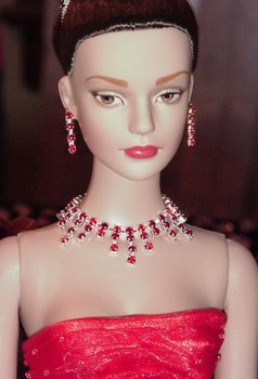 This doll is an ideal candidate for fancy jewelry. She can wear just about anything - gold or silver. I have a few sets that I have created with Light Siam stones, a bright orangy-red which matches her gown perfectly. Alternatively, I have many other styles in ruby stones which look nice, but the color is not AS perfect. All clear stones are also dazzling!