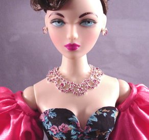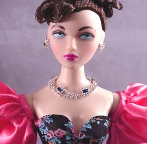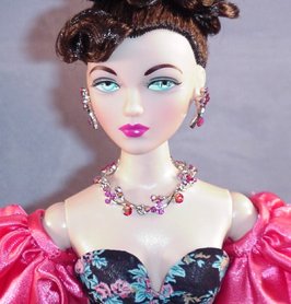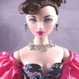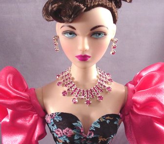 This doll has an over the top dress (well, the gloves are over the top) and can carry off all kinds of jewelry. The colors in the dress allow you to pick up a variety of colors in jewelry - fuchsia, pink, sapphire, aqua... Or you can go with all clear stones, aurora borealis (rainbow coated) or pearls.