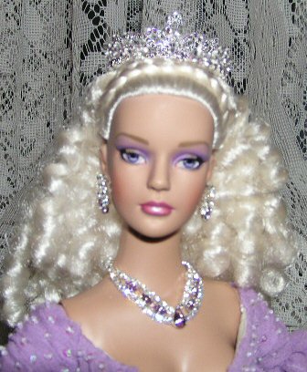 The colors of her dress are best emphasized with either light amethyst or aurora borealis stones.