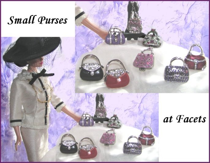 These purses are sized for dolls like Fashion Royalty, Silkstones, Barbies, Tiny Kitty Collier, and Fashion Royalty. For purses for larger dolls, click here.